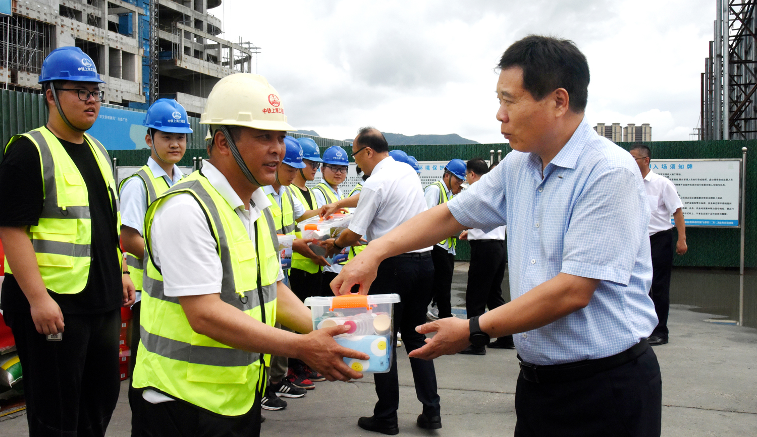 728日,市總工會黨組書記、副主席丁維杰帶領(lǐng)市總工會相關(guān)部門負(fù)責(zé)人一行,在集團公司黨委副書記、工會主席戴鴻鳴的陪同下,看望慰問奮戰(zhàn)在市重大項目一線的建設(shè)者,并送上防暑急救箱等慰問品。