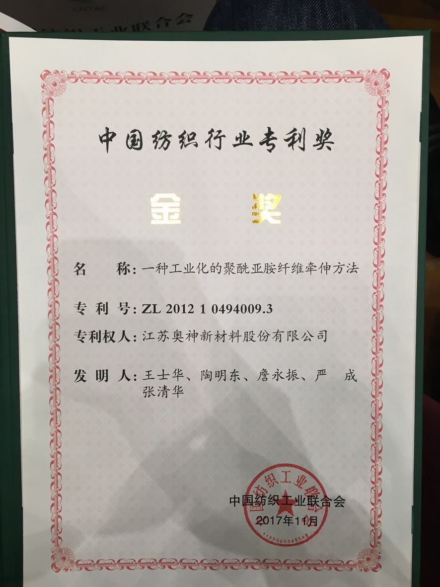 會上發(fā)布了首屆中國紡織行業(yè)專利獎、全國紡織科技創(chuàng)新人才等評審結(jié)果,集團(tuán)公司副總經(jīng)理王士華獲得“全國紡織科技創(chuàng)新領(lǐng)軍人才”榮譽(yù)稱號,并作為獲獎代表上臺發(fā)言。江蘇奧神新材料股份有限公司發(fā)明專利“一種工業(yè)化的聚酰亞胺纖維牽伸方法”獲得首屆中國紡織行業(yè)專利獎金獎。