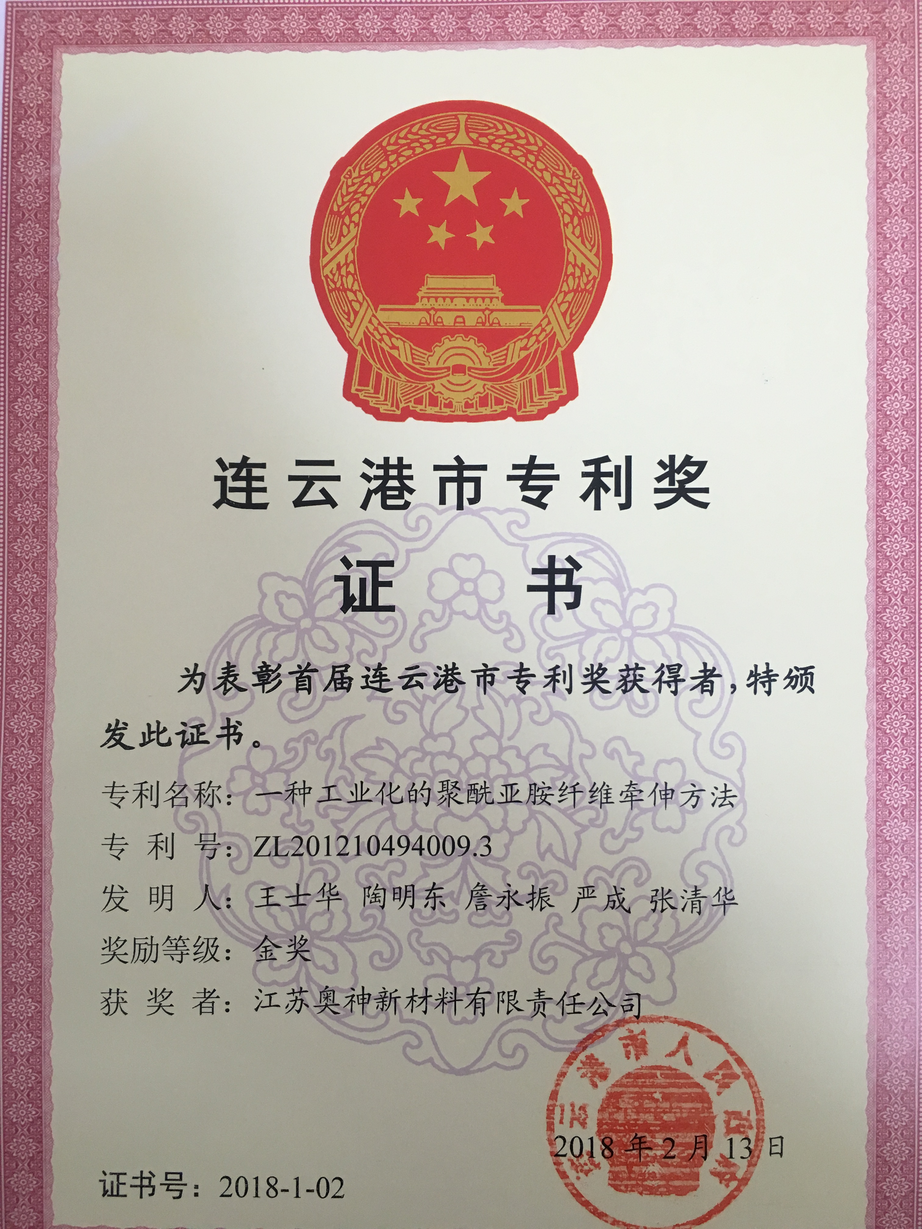 近日,奧神新材料公司“一種工業(yè)化的聚酰亞胺纖維牽伸方法”專利喜獲首屆連云港市專利獎金獎。
