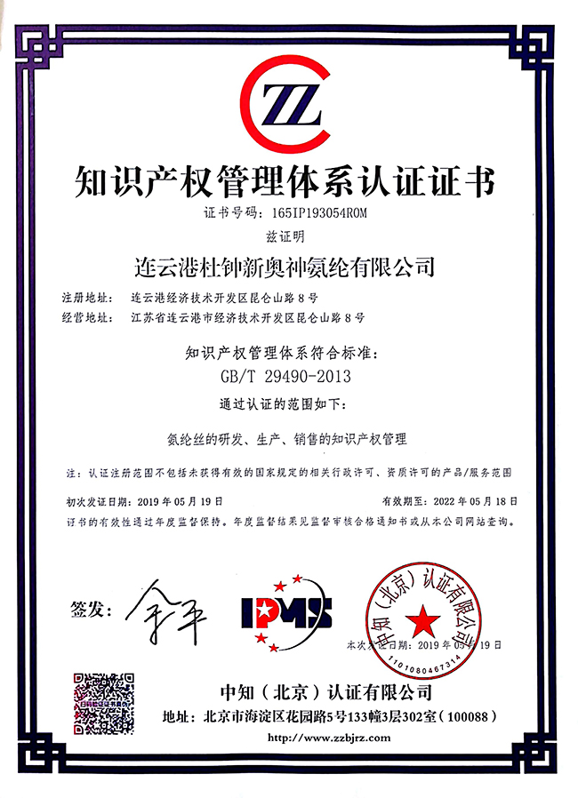 近日,中知(北京)認證有限公司對氨綸公司知識產(chǎn)權(quán)管理體系運行情況進行現(xiàn)場認證。認證公司對氨綸公司的各類管理文件、控制程序、內(nèi)審和管理評審文件等開展了現(xiàn)場審核,認為氨綸公司的知識產(chǎn)權(quán)體系運行符合《企業(yè)知識產(chǎn)權(quán)管理規(guī)范》GB/T29490-2013國家標準,授予氨綸公司“知識產(chǎn)權(quán)管理體系認證證書”。