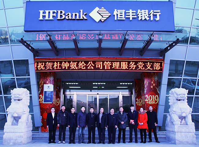 2019年1月16日,杜鐘氨綸公司管理服務(wù)黨支部赴恒豐銀行開展黨建結(jié)對共建交流活動。此次共建活動由公司總經(jīng)理張斌、副書記王克平帶隊,恒豐銀行行長劉偉陪同。