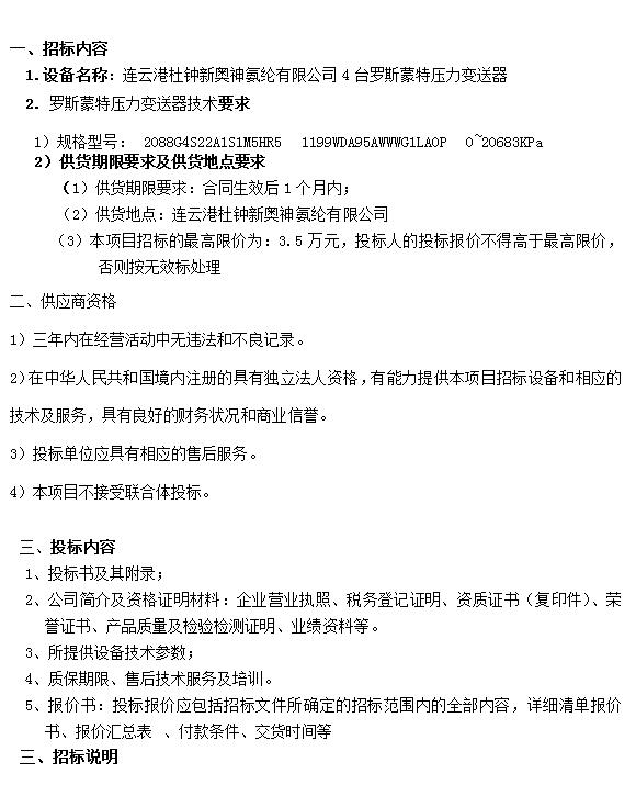 壓力變送器招標(biāo)公告