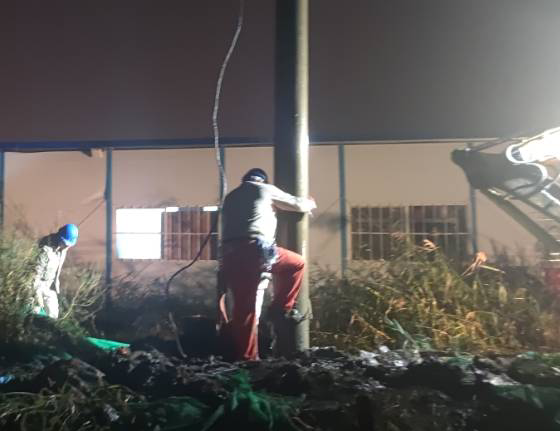 今年的10月天氣還是熱的厲害,電桿被太陽曬的滾燙,搶修人員臉上掛滿了豆大的汗珠,工作服已經(jīng)全部濕透。為了搶時間,抓進度,作業(yè)人員們?nèi)徊活櫍廊痪o張有序地工作著?,F(xiàn)場搶修工作涉及吊車、挖掘機等大型施工機具,安全管控尤為重要,現(xiàn)場所有搶修人員在工作負責人的指揮下平穩(wěn)有序的推進搶修工作,吊車擺放位置、挖掘機挖桿洞的位置等每一個關鍵工作點都在搶修人員的嚴格監(jiān)督下進行,不敢有絲毫松懈。就在這時,天公不作美,突然下起了大雨,可是大雨并沒有攔住搶修工作。臺北供電所現(xiàn)場所有的搶修人員在錢所長的帶領下,穿著濕透的工作服在雨中指揮挖掘機開挖桿洞、組立電桿、連接導線-------搶修人員在天昏地暗的雨中穿梭,雨水和汗水交匯在電力搶修人員的臉龐上,大家都來不急擦拭一下臉上的雨水,在雨中忙碌著。經(jīng)過4個半小時的緊張有序搶修,晚上19:30分10KV港北線恢復供電。