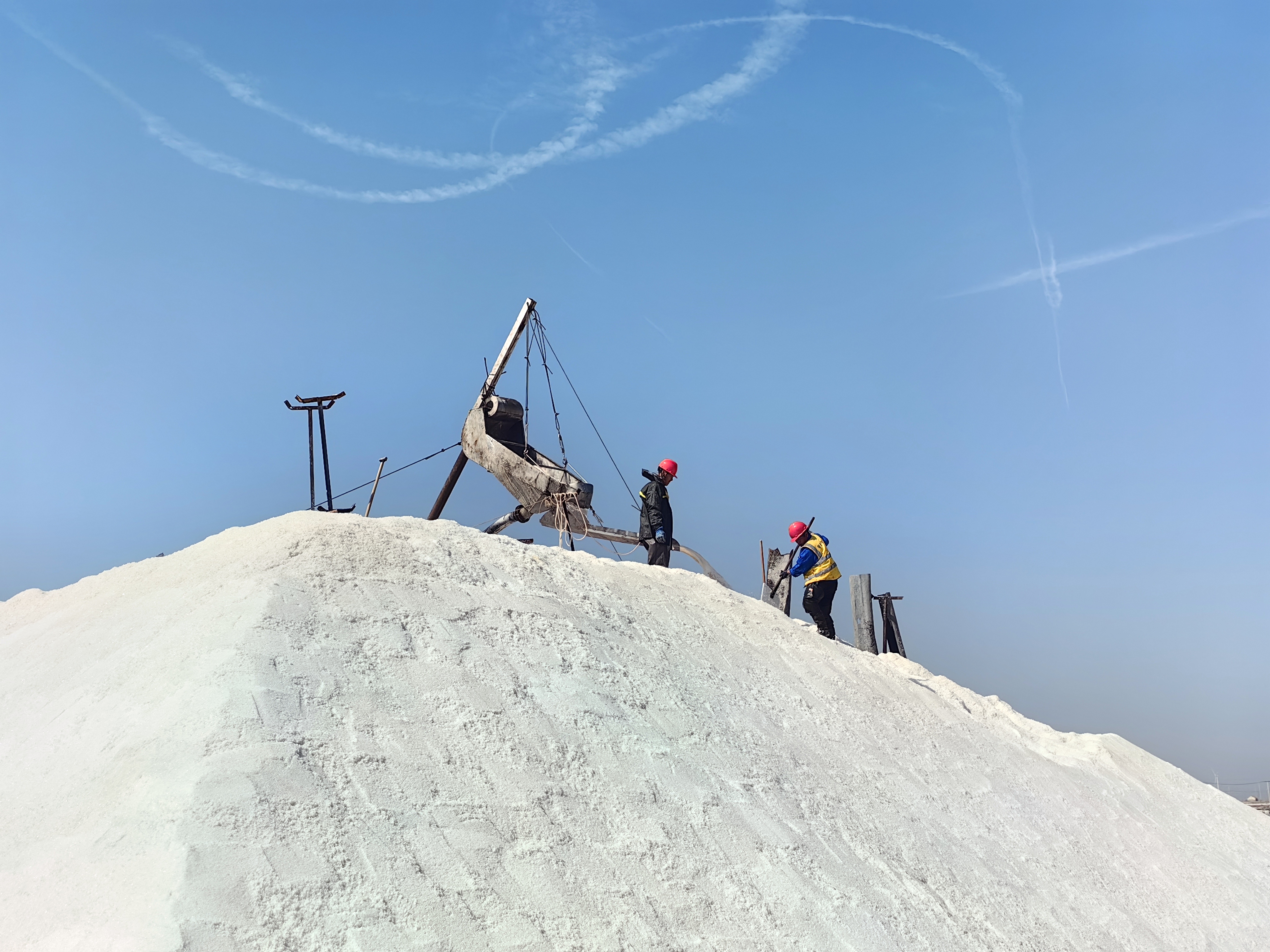 在八班扒鹽現(xiàn)場(chǎng),一臺(tái)唐三零扒鹽機(jī)正在鹽池里進(jìn)行扒鹽作業(yè),唐三零操作手駕駛著機(jī)械,在鹽田中央緩緩行進(jìn)著,不時(shí)的回頭觀察鹽泵吸鹽情況,確保扒鹽管道順暢。遠(yuǎn)處的廩基內(nèi),大廩工正在熟練地利用分流板對(duì)鹽篩中傾瀉下的原鹽進(jìn)行引導(dǎo)分流,熟練地打好廩墻。