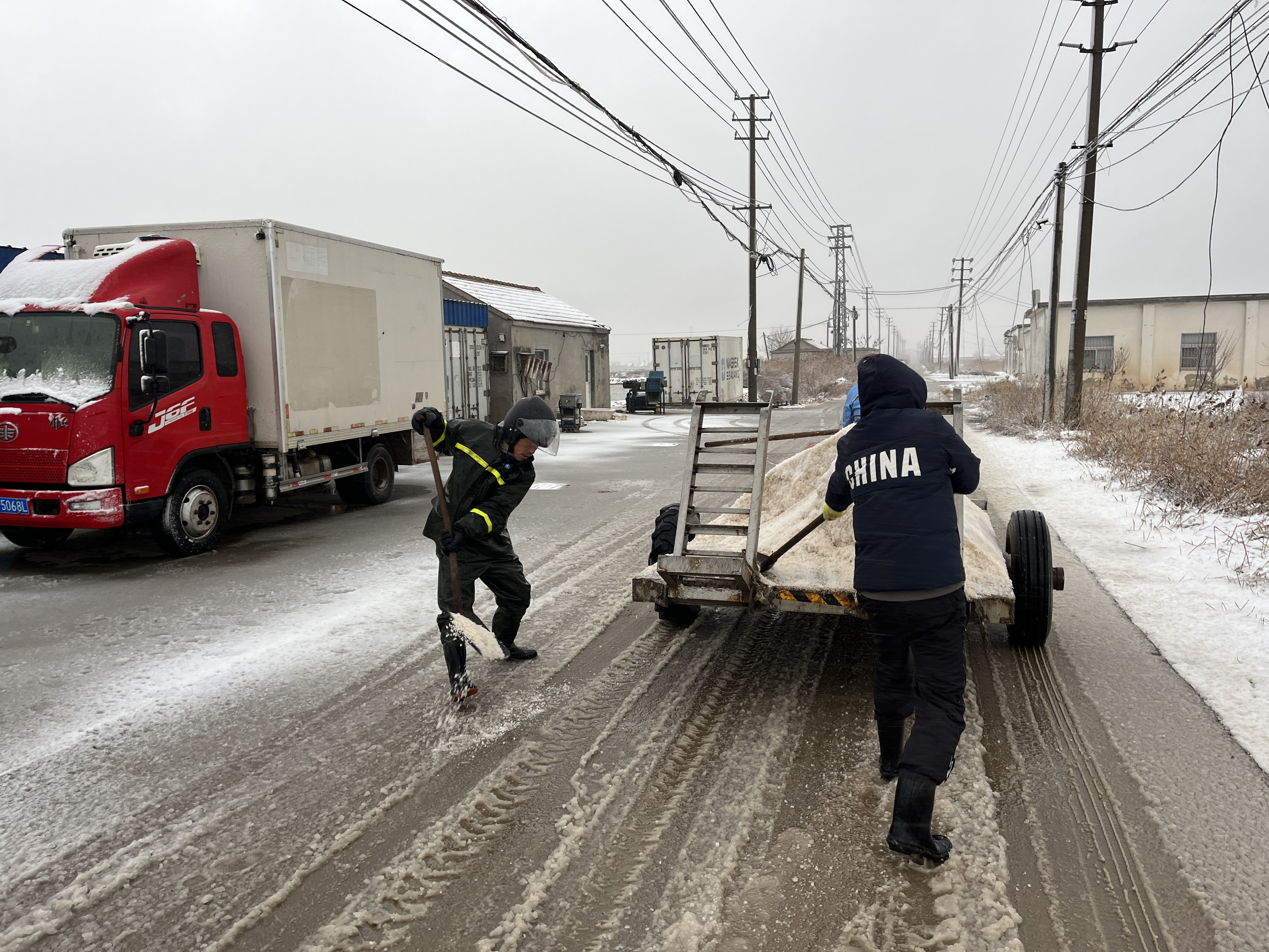 以雪為令,全力奔赴清雪戰(zhàn)一線。隨著降雪量增大,采取“人工+機械”的作業(yè)方式,使用自產(chǎn)原鹽融雪劑對轄區(qū)中二圩居民點、鹽灘內(nèi)部道路、辦公區(qū)域等20余條主次干道不間斷地毯式清雪除冰作業(yè)。清雪現(xiàn)場,大家不畏嚴寒,積極行動,鏟的鏟、推的推,干得熱火朝天,開辟出一條方便群眾出行的“安全路”。截止目前,已累計出動車輛30余臺次,300余人次參與清雪除冰行動,確保職工群眾“雪中通行,雪后路清”。