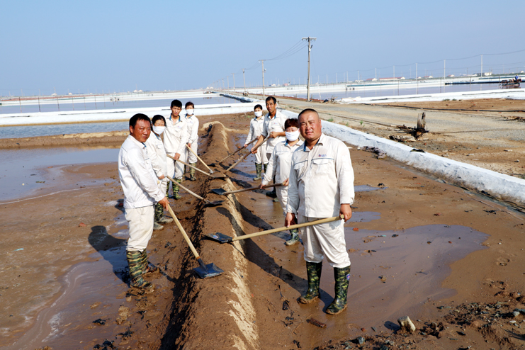 趁著休息的間隙,筆者與身邊忙得滿頭大汗的8班班長祝星星聊了起來。據(jù)祝星星介紹,每天員工4點(diǎn)半就到灘頭,進(jìn)行鹽池的人工活碴、稟基修復(fù)、鹽池鹵水補(bǔ)充、收放設(shè)備檢查等一系列工作,因此,合理安排工作量非常重要。他告訴筆者,室外工作工人的勞保服比較厚,一天下來工作服濕了又干,干了又濕,衣服上都泛出厚厚的鹽漬。一天下來,全班要消耗2大桶甚至更多的飲用水?,F(xiàn)在公司里對(duì)我們一線生產(chǎn)崗位員工非常關(guān)心,防暑降溫工作非常到位。最近,單位又為我們發(fā)放高溫津貼、電風(fēng)扇、防暑降溫藥品。這些讓我們員工真切感受到組織的力量,組織得偉大,所以雖說現(xiàn)在比平時(shí)更辛苦,我們有信心戰(zhàn)高溫、奪高產(chǎn)。