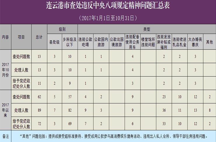為進一步貫徹落實中央八項規(guī)定精神,連云港市紀委建立了落實中央八項規(guī)定精神情況月報制度。2017年1月1日至10月31日,全市查處違反中央八項規(guī)定精神問題情況如下: