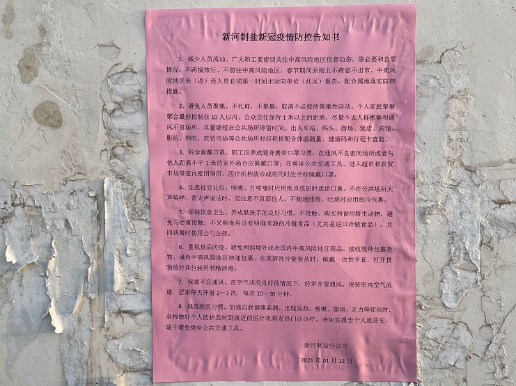 春節(jié)臨近,人員流動增加,根據(jù)灌西投資公司疫情防控工作的需要,結(jié)合冬春季疫情形勢,為切實加強生產(chǎn)一線疫情防控工作 ,進(jìn)一步防范疫情輸入,提高職工自我防護意識,新河制鹽分公司1月12日在公司醒目位置張貼《疫情防控告知書》,并對各個班組發(fā)放《疫情防控告知書》,每位員工簽字并存檔。