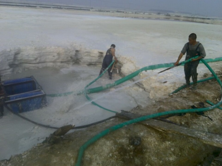 近日來,連續(xù)高溫酷暑天氣對日曬制鹽員工提出了生理挑戰(zhàn),新河制鹽廣大員工直面高溫,不畏酷暑,積極做好除硫工作,保證原鹽質(zhì)量。圖為除硫現(xiàn)場操作手緊握高壓水槍,對硫酸鈣沉淀區(qū)進(jìn)行沖刷。(新河制鹽 邱利民)