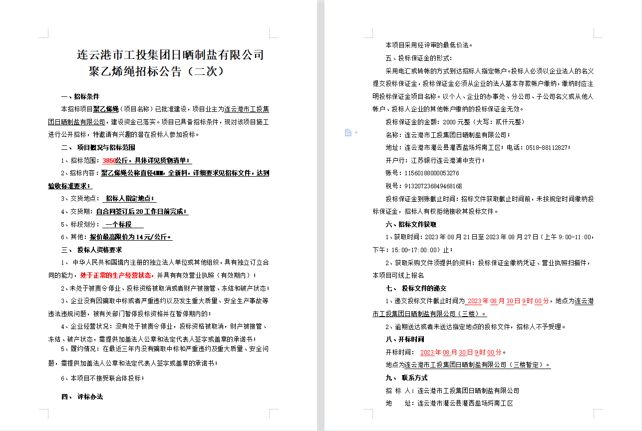 連云港市工投集團(tuán)日曬制鹽有限公司聚乙烯繩招標(biāo)公告(二次)