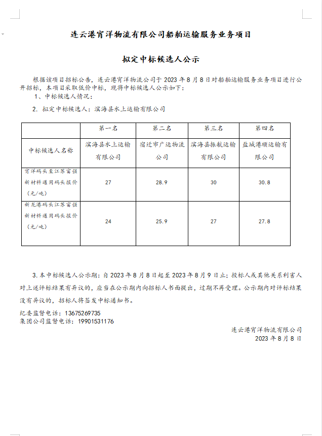 連云港宵洋物流有限公司船舶運(yùn)輸服務(wù)業(yè)務(wù)項目擬定中標(biāo)候選人公示