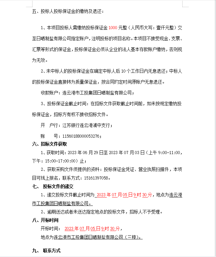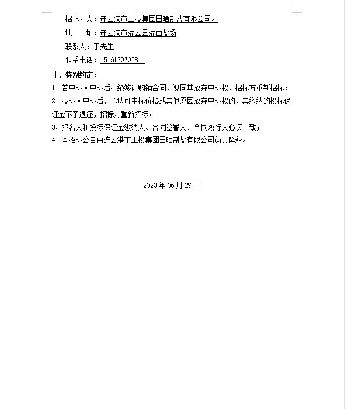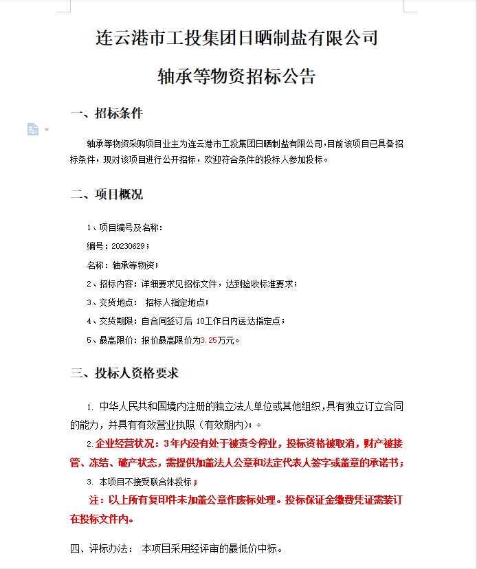 連云港市工投集團日曬制鹽有限公司軸承等物資招標(biāo)公告
