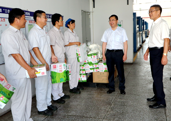 8月1日上午,集團(tuán)公司黨委副書記戴鴻鳴、工會(huì)主席劉承志來我公司慰問生產(chǎn)一線員工,為辛勤工作的員工送來牛奶、綠豆等防暑降溫慰問品。公司黨支部書記、副董事長(zhǎng)鄒德兵,總經(jīng)理韓立新等多位領(lǐng)導(dǎo)陪同。