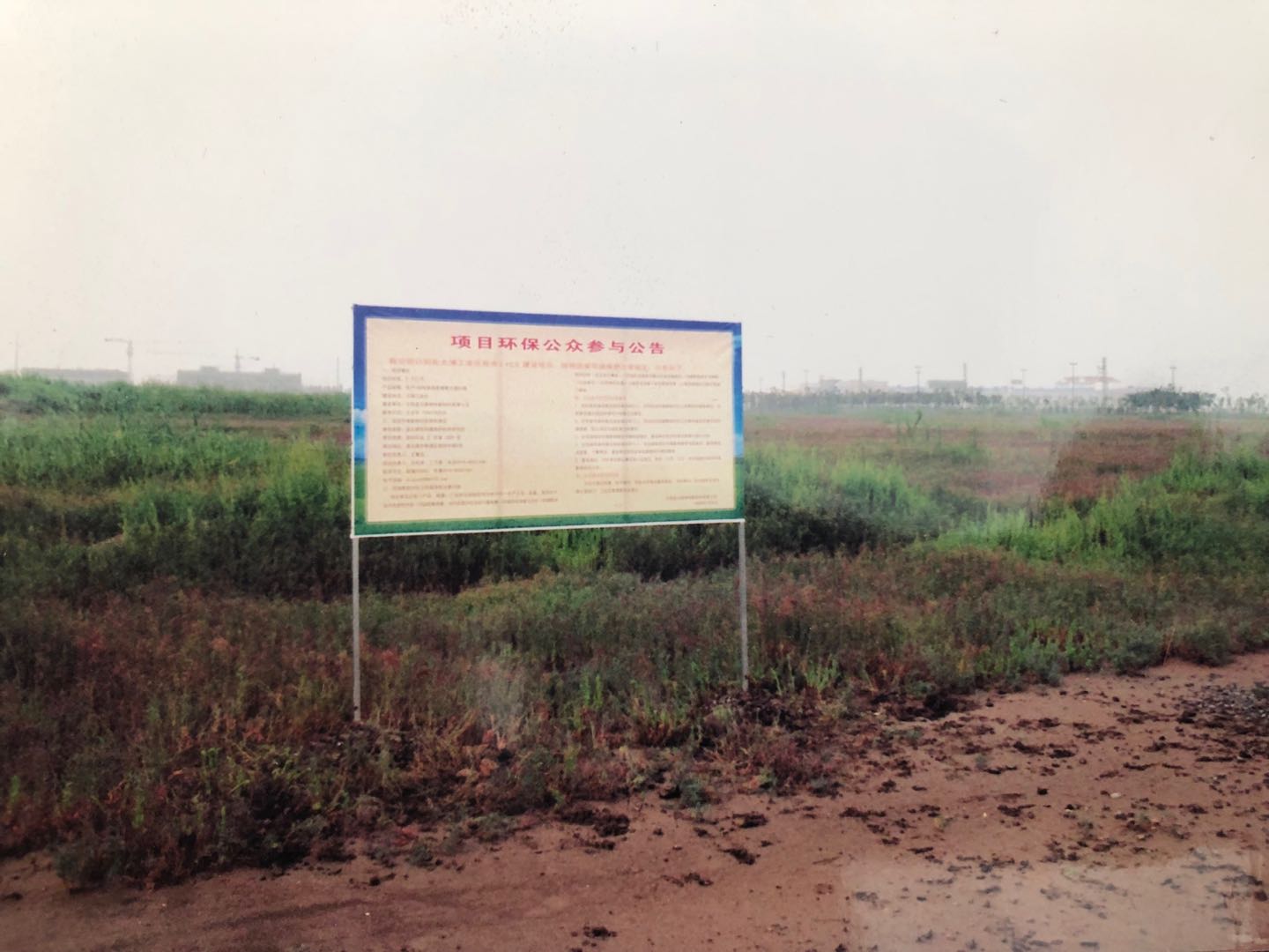 這是神特公司籌建時(shí)期的環(huán)評現(xiàn)場公示照片,是2008年8月底拍攝的。照片的重點(diǎn)部分是一個(gè)大牌子——項(xiàng)目環(huán)保公眾參與公告的牌子,位置大約在現(xiàn)在一期傳達(dá)室附近。做這樣的牌子是當(dāng)時(shí)環(huán)評的一個(gè)環(huán)節(jié),必須在建設(shè)場地進(jìn)行兩次公告,征求相關(guān)環(huán)境利益方的訴求。牌子的遠(yuǎn)方隱隱約約看見有些工廠和電力桿塔,牌子附近生長著茂密的堿蒿,一團(tuán)團(tuán)一簇簇,忽高忽低,可以看出地面是很不平整的。當(dāng)年豎牌子的時(shí)候,是雨后不久,地面較為泥濘,建設(shè)用地及周邊環(huán)境多多少少透射出一種蒼涼的感覺。
