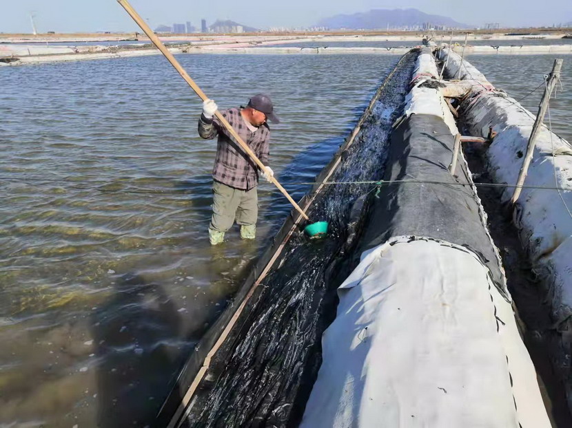 2021年,他服從公司生產(chǎn)機(jī)制的轉(zhuǎn)換,被安排到海濱三組18號灘作為領(lǐng)灘手,負(fù)責(zé)鈣液生產(chǎn)。為了不浪費(fèi)每一毫米的蒸發(fā)量,每天天剛蒙蒙亮,就能看見他在縱橫阡陌的鹽田間穿梭,根據(jù)灘田結(jié)構(gòu)、針對不同季節(jié)確定走水路線,每天重復(fù)著調(diào)節(jié)鈣液、修整溝堰、修補(bǔ)塑布的工作,遇到大雨,他就不回家,守在灘上,及時把鈣液按照不同濃度引進(jìn)鹵臺、鹵窖,雨水結(jié)束,第一時間把灘面淡水排掉,將鈣液回引進(jìn)行晾曬。在生產(chǎn)面積僅有311畝的情況下,他每天要走3萬-4萬步,不僅對他自己的生產(chǎn)單元,對整片鈣液生產(chǎn)單元了如指掌,有多少閘門,多少電線桿,都了然于心。全年下來,生產(chǎn)鈣液28000方,在12個鈣液生產(chǎn)單元中名列前茅,領(lǐng)先超9000方,實(shí)至名歸的生產(chǎn)標(biāo)兵。