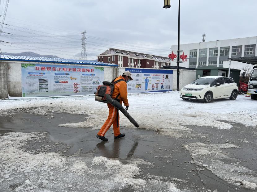 在清理工作現(xiàn)場,該公司負責人趙陽帶領黨員干部攜帶各種除雪工具,先后來到各自的責任區(qū)開始清除積雪,有的奮力潑灑融雪劑;有的拿著大板鍬,推著積雪露出一道道干凈的路面;有的在寒風中不停地揮舞著手中的鐵锨,使勁清理著被汽車壓結實的冰渣;有的將積雪一點點地集中到一起,然后用掃帚掃凈路面,大家你鏟我掃,團結協(xié)作,干勁十足,一片熱火朝天的除雪景象。