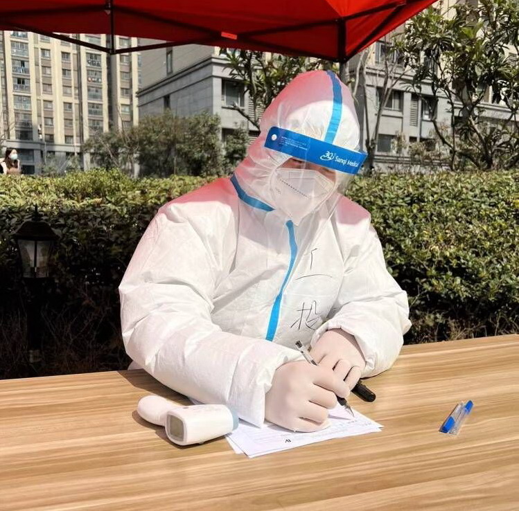 3月12日,社區(qū)統(tǒng)一安排,換了崗位,經(jīng)過崗前細(xì)致培訓(xùn)后,負(fù)責(zé)信息登記、測試體溫、發(fā)放檢測卡,服裝也由一次性塑料服換上了“大白服”。服裝升級(jí)了,說明防護(hù)級(jí)別也升級(jí)了,他二話沒說,服從安排,迅速到崗?!澳?,請(qǐng)?jiān)谶@邊登記信息,測量一下體溫”,這是他每天重復(fù)最多的話,他穿著密閉的防護(hù)服,連上一趟衛(wèi)生間都成了一件很奢侈的事情,為了節(jié)約醫(yī)療物資,早晨不敢多喝水,工作期間不喝水,直到檢測結(jié)束才和其他工作人員一起吃飯。有人問:“這項(xiàng)工作有風(fēng)險(xiǎn),怕不怕?”他說:“怕,當(dāng)然怕,但和身邊的醫(yī)護(hù)人員比起來,我這點(diǎn)真不算什么,向他們致敬!”目前,他所在小區(qū)已經(jīng)進(jìn)行了13次全員核酸檢測,他每次早上7點(diǎn)到崗,下午2點(diǎn)左右結(jié)束,脫下防護(hù)服后背都是濕漉漉的。
