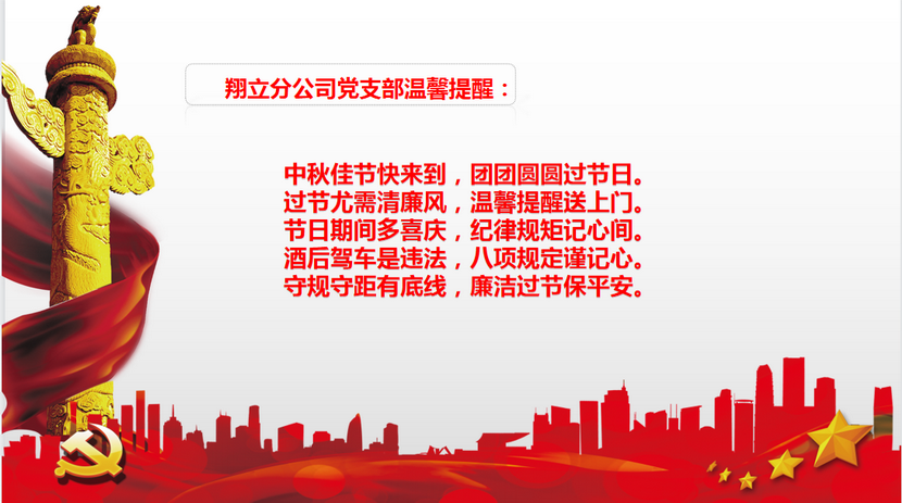? ? 為筑牢廉政“防火墻”,確保佳節(jié)期間風清氣正,95日,翔立分公司黨支部通過微信向全體黨員干部職工發(fā)送廉潔小短信,提醒全體職工拒腐戒奢,廉潔過節(jié)。