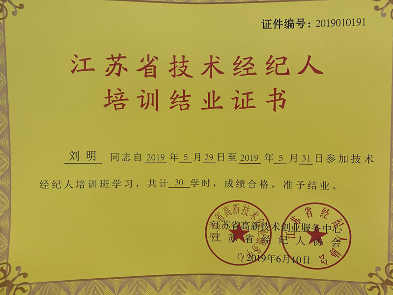 為提高公司服務(wù)質(zhì)量、豐富公司人才類型,美多利公司組織員工參加了江蘇省經(jīng)濟技術(shù)經(jīng)紀(jì)人培訓(xùn)課程并獲得了培訓(xùn)結(jié)業(yè)證書。