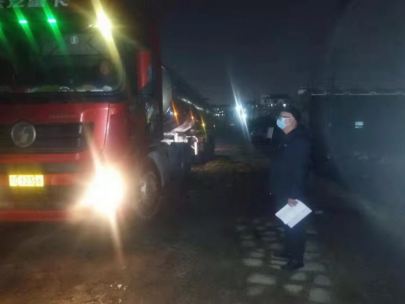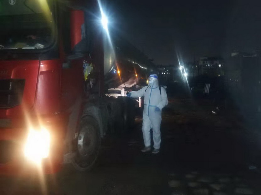 在登記信息的過程中,公司紀檢專員孫健細心的發(fā)現(xiàn)駕駛?cè)藛T的不對勁,“師傅,您看起來很疲憊,是身體不舒服嗎?”“小伙子觀察真是細致,我只是太餓了,閉環(huán)管理規(guī)定駕駛員不準離車,所以我從鹽城出來4個多小時還沒有吃晚飯。”“師傅,您稍等一下,我去給您買份快餐,再給您燒壺熱水!”當駕駛員吃完快餐,鈣液車也裝貨結(jié)束,此時已是晚上9點40分,按照“方案”規(guī)定,“大白”程輝對車輛進行離場消殺,并拍攝相應消殺照片,上傳系統(tǒng)。