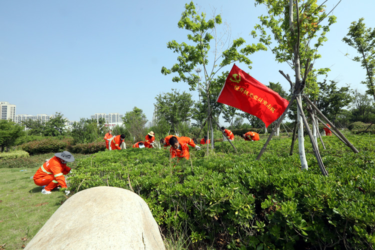 活動分為四組進行,四組黨員突擊隊跟隨引導(dǎo)員的腳步到達各自片區(qū),進行綠化帶雜草清除作業(yè)。在各組支部書記的帶領(lǐng)下,勞動中人人做表率,個個干勁足,有條不紊互相配合,一抹抹橘色在清新草色的襯托下格外美麗。
