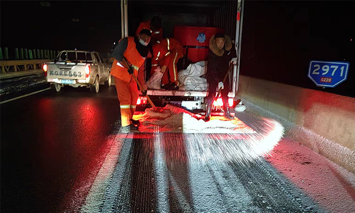 該公司除雪突擊隊(duì)由總經(jīng)理徐習(xí)華和副總王利分頭帶隊(duì)指揮,集結(jié)了安全部、管養(yǎng)部、綠化、保潔、市政、環(huán)衛(wèi)的突擊隊(duì)員80余名,出動(dòng)5輛皮卡車、3輛皮卡、1臺(tái)裝載機(jī)和2輛巡查車,主要負(fù)責(zé)新區(qū)內(nèi)橋梁、連云開(kāi)發(fā)區(qū)橋梁、徐新路、疏港大道、228省道等主要交通干道布撒融雪劑抗凍救災(zāi)工作。突擊隊(duì)員在進(jìn)行融雪劑撒布作業(yè)的同時(shí),及時(shí)清理路面融化雪水,防止再次結(jié)冰,各除雪設(shè)備配合作業(yè),階梯式向前推進(jìn),提高除雪效率。(李敏 王宜全)